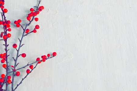 Winterberry branches on white old table.Vintage filters applied.