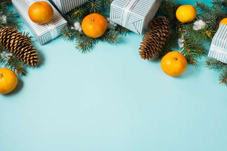 Christmas blue background with fir tree and tangerines.