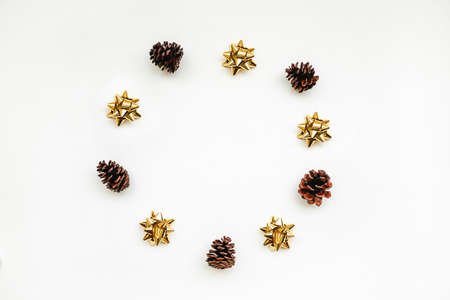 Festive golden bows and cones on a white background located in a circle. Christmas or New Years minimal conceptual background.