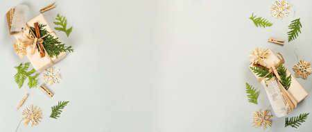 Zero waste gift concept. Christmas or New Year eco-friendly packaging. Festive boxes in craft paper with different organic decorations. Light gray background, flat lay, banner