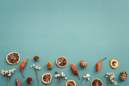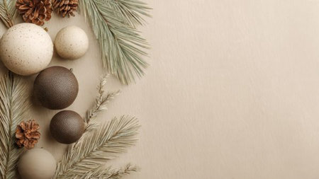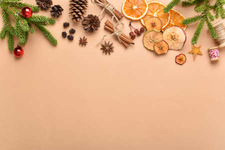Natural decor for eco-design. Christmas background. Merry Christmas. Copy space. Flat lay, top view.