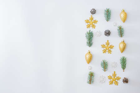 Flat lay border with fir branches, christmas baubles decoration and snowflakes on a white background