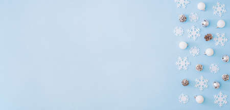 Flat lay border with christmas balls and snowflakes on a blue background