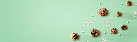 Christmas pine cones with snow flakes - flat lay