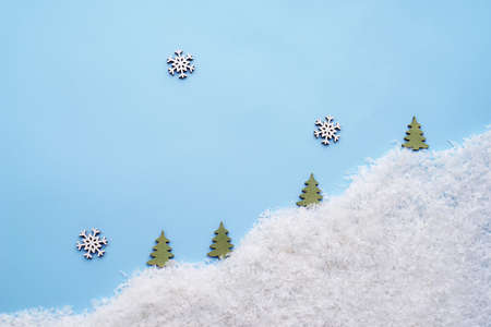 Small snowflakes and Christmas trees on a laconic blue background. A template for late postcards, calendars. Top view.