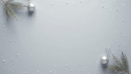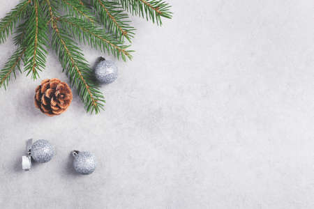 Festive silver baubles, christmas tree branch and pine cone on grey. Noel background with copy space.