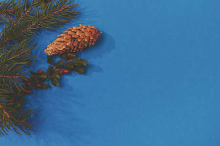 Pine branches and cones located in the lower corner on a blue concrete background, top view. The concept of the new year 2021 and Christmas.