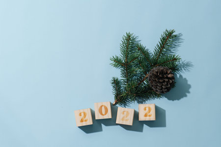 Cubes with 2022 number and fir tree branch with a cone over blue surface. new year composition.