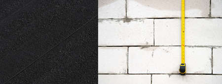 yellow measure tape on construction white and black brick banner wall background