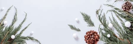 White minimal Christmas border with christmas tree branch, decor and cones, flat lay, copy space, web banner