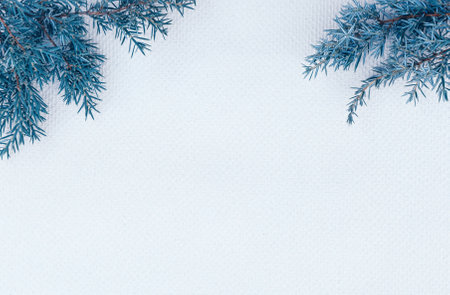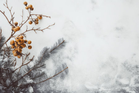 Christmas background of snow-covered branches with berries. Flat lay, top view. Copy space for text.