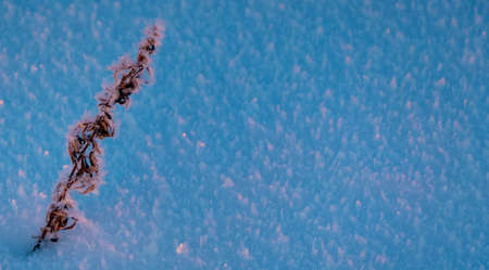 Close-up view of frost-covered plants in a winter field. Serenity and peace.