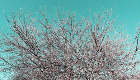 Tree branches covered with snow in springtime. Winter blue fairy tale