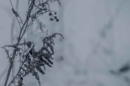 On a cold winter day, delicate stems of wildflowers are covered in snow and frost, creating a beautiful winter landscape. The background.