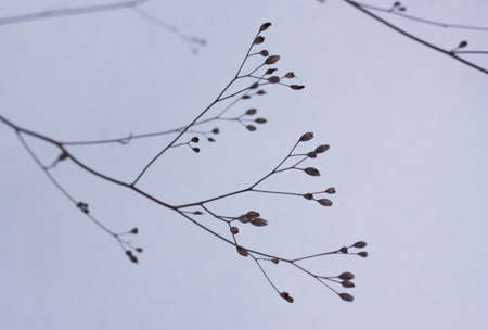 On a cold winter day, the delicate stems of wildflowers are covered with snow and frost. It's cold outside. Background.