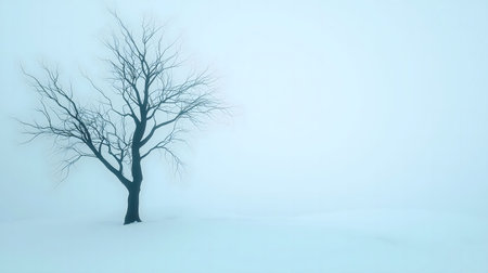 A lone, leafless tree stands in a misty winter scene. The image evokes a sense of peace and solitude.
