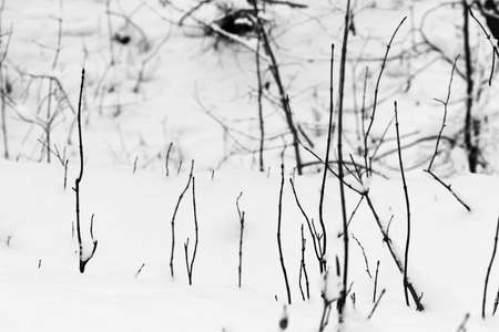black winter landscape photography of forest flora, snow covered branches close-up