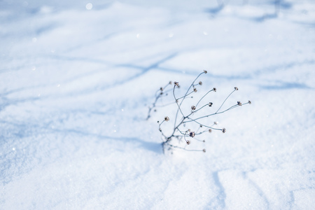 dry plant remains covered by snow by winter morning
