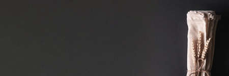The concept of ecological etiquette - three reusable string bags with three branches of wheat folded by the rope, banner.