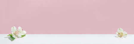 blooming cherry twig with green small leaves lies on a pastel pink background close-up, photo banner with space for your text. Spring blank template template