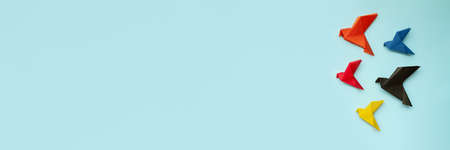 banner five paper origami different colors on light blue background flying to left, copy space