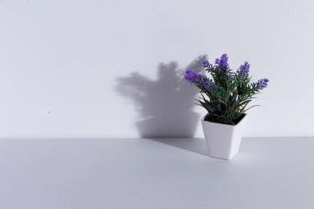 Artificial purple lavender plant on white table with hard shadow cast on wall with space for text