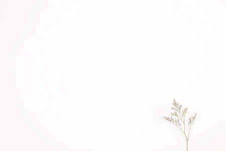 Abstract set of dried flowers on a white background, dry twigs of a lemon statice plant, top view