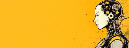 futuristic robot of new generation, yellow banner with copy space, made with Generative AI
