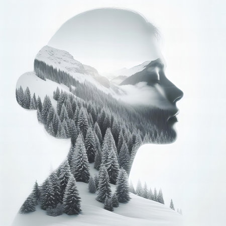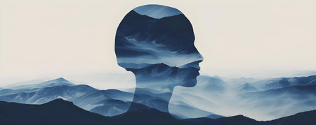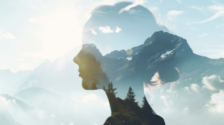 Artistic representation of a woman's profile merged with a stunning mountain landscape and soft clouds, symbolizing peace and natural beauty.