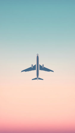 A minimalist silhouette of an airplane in flight against a pale sky. This image is perfect for airlines and flight booking agencies looking for a sleek and modern design.