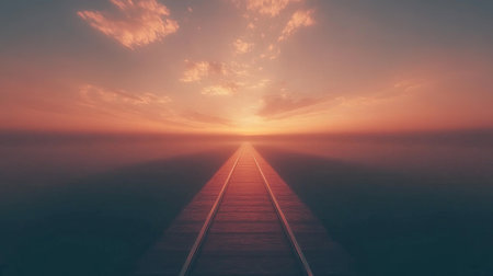 Sunset view of railway tracks glowing in golden light, leading into the horizon with soft clouds and warm colors in the sky