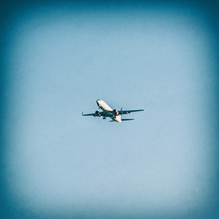 Aircraft is landing in the holiday destination. Summer vacation. Transporting theme. Analog photo filter with scratches.