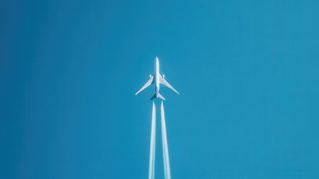 A majestic airplane soaring high in a clear sky, leaving a trail of condensation, symbolizing travel and freedom.
