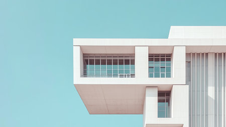 A striking capture of a modern architectural corner showcasing sleek lines and geometric precision set against a clear blue sky, embodying contemporary design aesthetics.