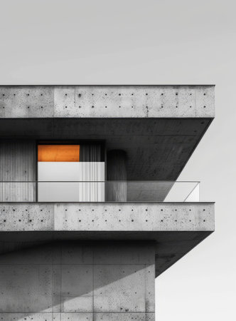 A sleek concrete building showcases minimalist design elements. The structure features clean lines and geometric shapes set against a backdrop of an empty sky enhancing its modern appeal.