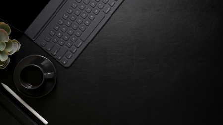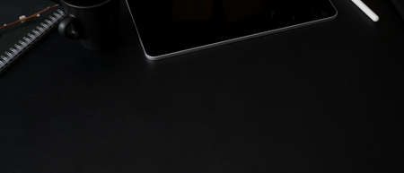 Top view of dark modern workplace with tablet, stylus, coffee cup, decorations and copy space on black table