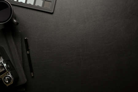 Top view of dark concept office desk with camera, notebook and copy space on black table