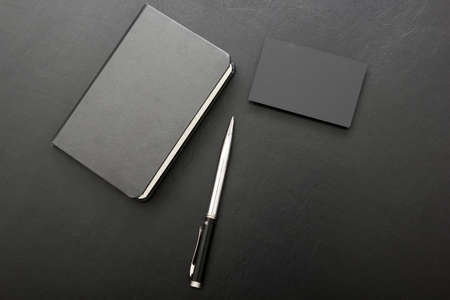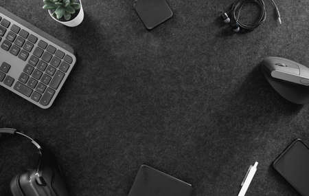 Top view flat lay of business working place. Empty workspace on table. Black minimalism.