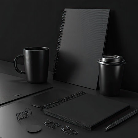 An overhead shot presents various black office accessories. A notepad and mug stand beside a disposable cup. A pen, paperclips, and a coaster are also displayed. The composition exhibits a modern aesthetic with contrasting textures. Suitable for illustrating stationery themes or design concepts, ideal for commercial or editorial applications.