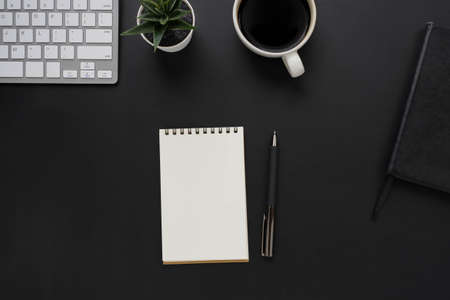 Top view above of Black office desk table with keyboard, notebook and coffee cup with equipment other office supplies. Business and finance concept. Workplace, Flat lay with blank copy space.