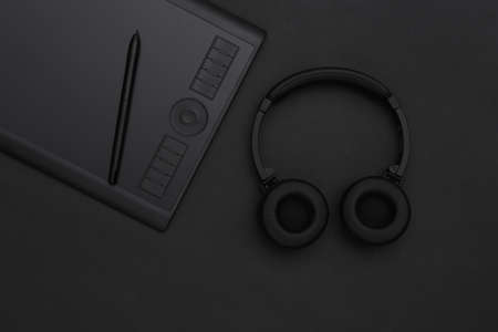 Headphones and laptop computer on black desktop. Listening to music, audio, sound concept.