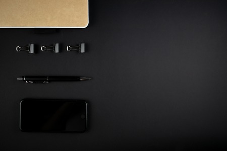 Top view of dark modern workplace with mock up smartphone and office supplies with copy space on black table background