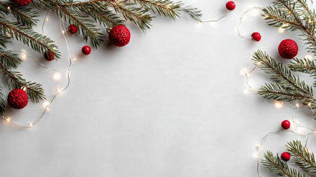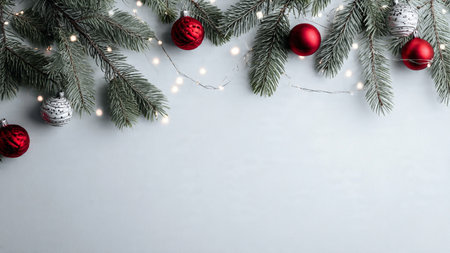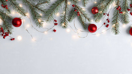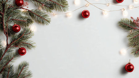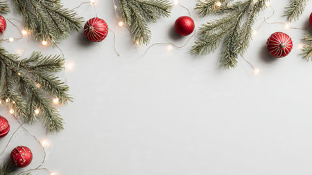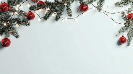 Modern Christmas background layout with pine branches, subtle ornaments, and glowing fairy lights.