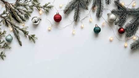 Festive Christmas scene with fir branches, ornaments, and lights.