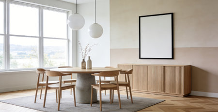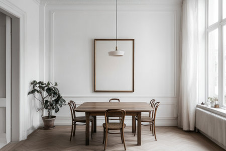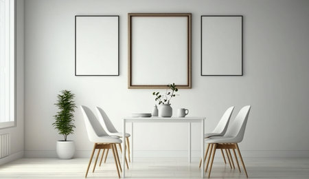 A realistic illustration of Mock up poster blank frame in dining room interior with white wall background made by generative Ai.