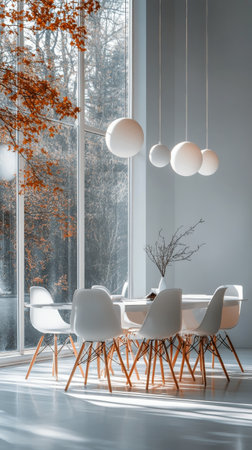 A bright dining space illuminated by pendant lights, showcasing a white table surrounded by elegant chairs. Large windows reveal a serene outdoor view with autumn foliage.
