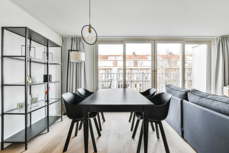 Dining room with wooden table and black chairs. Suitable for home decor and interior design projects.