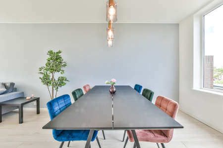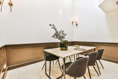 Modern dining table with set of blue velvet chairs and vase of flower on top in dining room of classic apartment