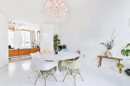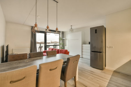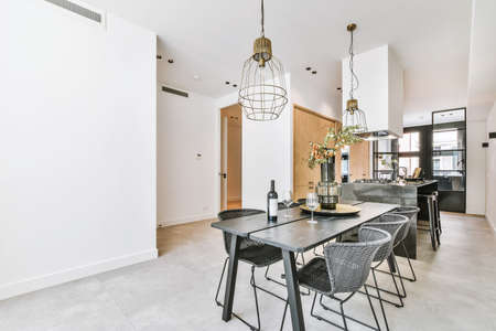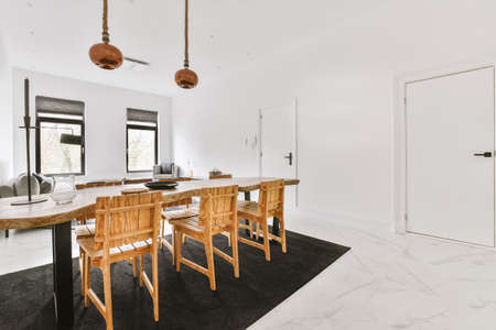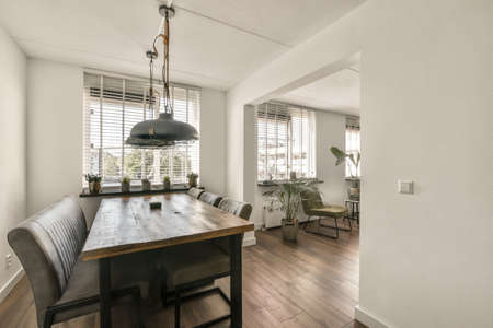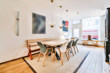 Modern design of apartment dining room with wooden table and chairs with bench under pendant lamps