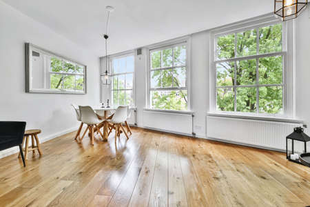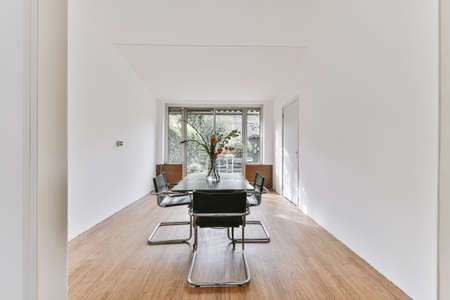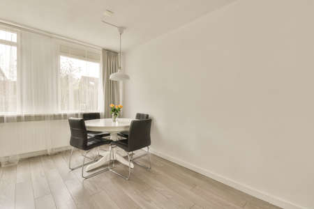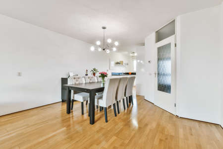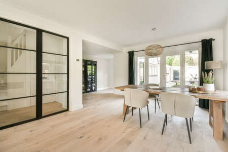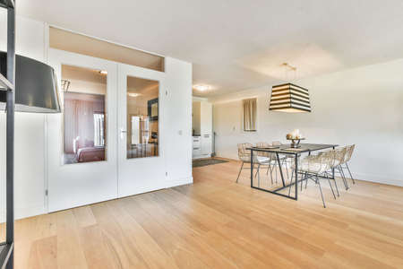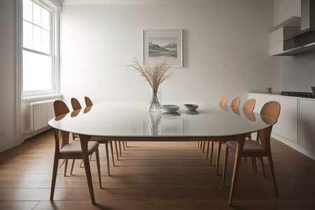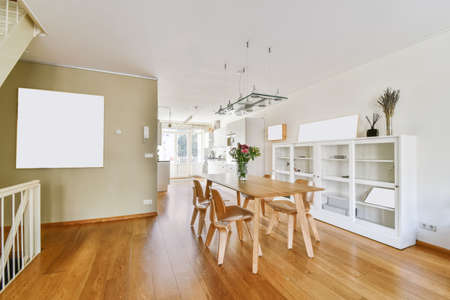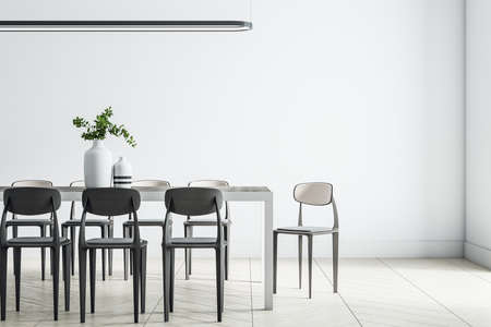 Interior of modern dining room with white walls and wooden floor. generative ai